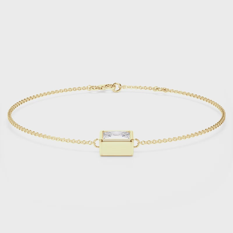 This timeless bezel set diamond bracelet, made with your choice of diamond centre stone, features a 1.00ct princess cut diamond set in 18ct gold. Exuding fluidity in its line work, and boasting an elegant silhouette, as with all the pieces in our Bespoke Collection, this piece is made especially for you. Final price is determined following your centre stone selection.